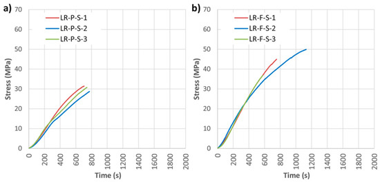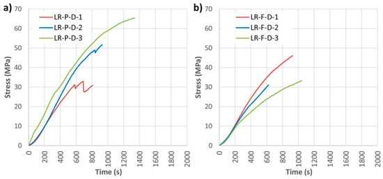 Stress against time for longitudinal reinforced beams (LR): (a) LR-P-D; and (b) LR-F-D. CFRP supplier: DRIZORO®.