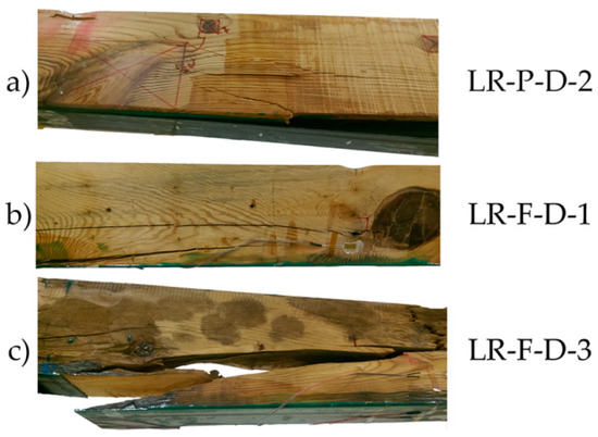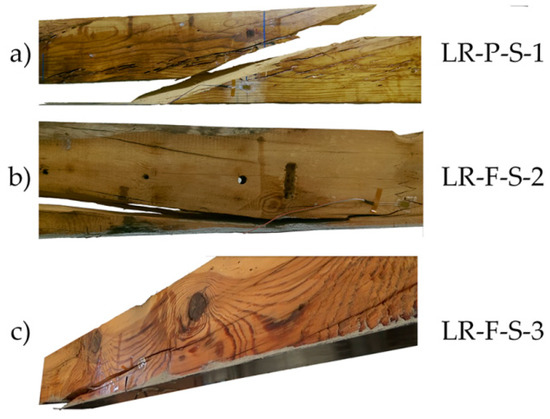 As shown in Figure 11, the bending stress capacity was improved in all cases with respect to the non-reinforced beams. In general, results are similar to the results obtained with SIKA products. The improvement of corrected MOR for groups LR-P-D and LR-F-D with respect to the NR beams was of 42.47% and 33.48%, respectively; MOE improvement was 41.44% and 20.28%, and the maximum deflection improvements amounted to 20.99% and 8.43%, respectively. In the LR-P-S and LR-F-S beams, the type of failure was caused by the shear stress, as shown in Figure 12. Important defects, mainly knots, are observed in all cases.