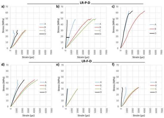 Stress against strain during bending tests: (a) LR-P-D-1; (b) LR-P-D-2; (c) LR-P-D-3; (d) LR-F-D-1; (e) LR-F-D-2; and (f) LR-F-D-3. CFRP supplier: DRIZORO®.