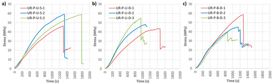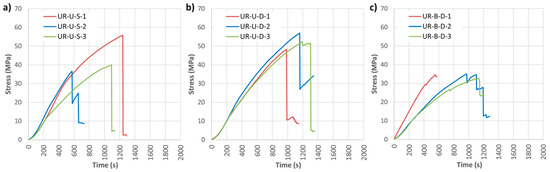 Bending stress against time for U-shaped reinforced beams (UR): (a) UR-U-S; (b) UR-U-D; and (c) UR-B-D. CFRP suppliers: SIKA® and DRIZORO®.