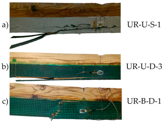 Breakage patterns of the UR beams group: (a) UR-U-S-1; (b) UR-U-D-3; and (c) UR-B-D-1. CFRP suppliers: SIKA® and DRIZORO®.
