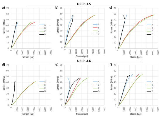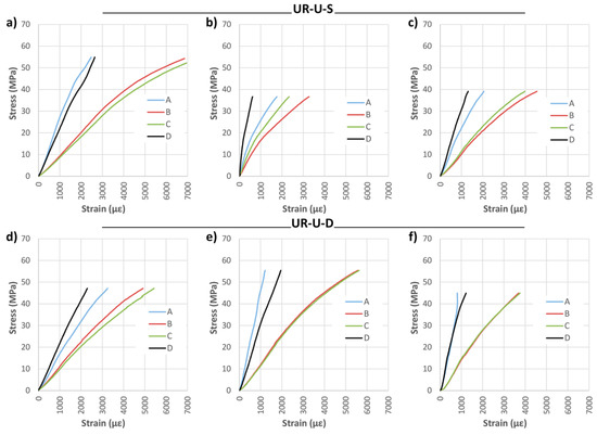 Stress against strain during bending tests: (a) UR-U-S-1; (b) UR-U-S-2; (c) UR-U-S-3; (d) UR-U-D-1; (e) UR-U-D-2; and (f) UR-U-D-3. CFRP suppliers: SIKA® and DRIZORO®.