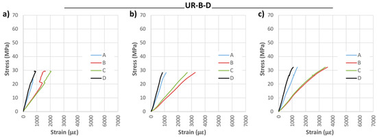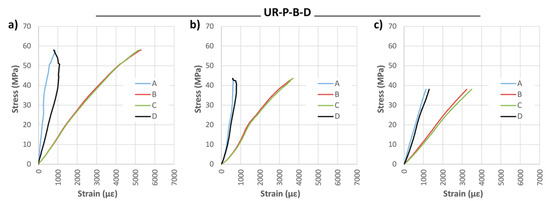 Stress against strain during bending tests: (a) UR-B-D-1; (b) UR-B-D-2; and (c) UR-B-D-3. CFRP supplier: DRIZORO®.
