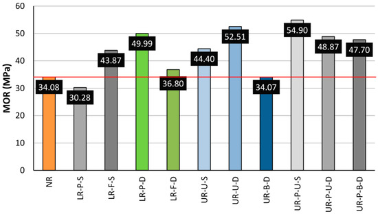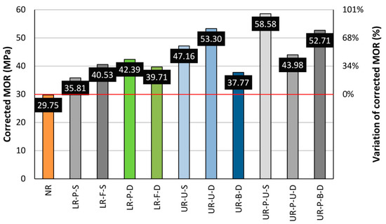 Once a detailed analysis of the different layouts had been carried out individually, a general comparison was depicted, in Figure 22 and Figure 23, to represent the average MOR and corrected MOR. The horizontal red line indicates the average MOR for the non-reinforced beams.