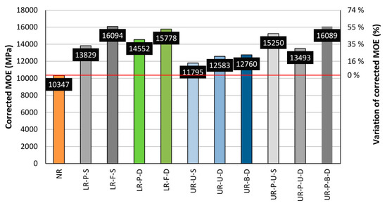 Figure 24 displays a comparison in terms of the corrected MOE. The corrected MOE was calculated similarly to the corrected MOR, i.e. by means of the DC correction factor. It can be seen that the UR group gave lower values of MOE, but with a relevant 19.64% improvement of the corrected MOE with respect to the NR beams.