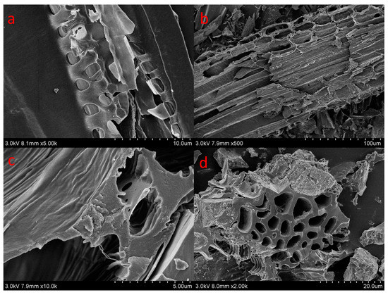 Scanning electron microscope images of C300 (a); C700 (b); P300 (c); and P700 (d).