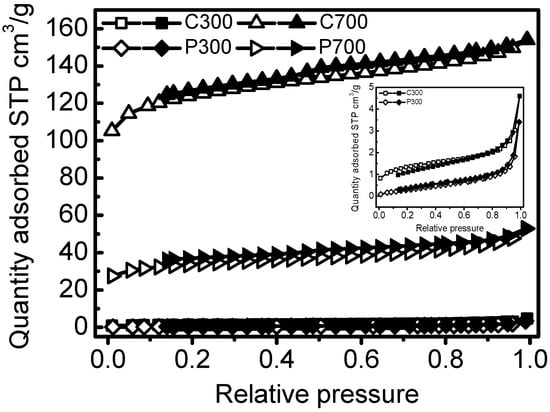 C700 and P700 samples exhibited larger surface areas (375.89 m2/g and 105.88 m2/g) and pore volumes (0.2302 cm3/g and 0.0721 cm3/g) than that of C300 and P300. Corn straw biochars also had higher surface areas and pore volumes by comparing with that of poplar leaf biochars. The average pore sizes of the biochars ranged from 3.98–12.27 nm (Table 1). The SEM micrographs of the biochars were demonstrated in Figure 1. C300 and P300 samples had fewer pores and more smooth appearances. At low temperature, amorphous carbons were the main carbons, and pores were not well developed. C700 and P700 presented uniform tunneling macropore structures in Figure 1b,d. C700 also had some smaller pore structures inside the tunneling macropores. Due to the high temperature, the tunneling structures had been crushed. The adsorption and desorption isotherms for biochars are shown in Figure 2. The similar isotherms of C700 and P700 suggested that the adsorption of N2 on biochars may follow similar kinetics [] because of their similar pore structures. For C300 as well as for P300, the isotherms are characteristic of non-porous materials or materials with large macropores, indicating no porous structure. The elemental compositions and atom ratios of biochars are shown in Table 2. The C contents and C/N ratios of corn straw biochars were higher than those of poplar leaf biochars. The low ratios of H/C (0.21 and 0.38) indicated the high aromatization of biochars [], because some of the amorphous carbon would be transformed into aromatic carbon at 700 °C []. The C contents, ash materials, and C/N ratios of the biochars were also greater at a higher pyrolyzing temperature. O/C was indicative of surface hydrophilicity, and (O + N)/C was recognized as the indice of polarity [,]. H, N, O, O/C, and (O + N)/C decreased with the pyrolyzing temperatures, due to the dehydration, decarboxylation, and decarbonylation in the pyrolysis process []. The distinct surface and structure characteristics of biochars, regulated by the biomass feedstock and pyrolytic temperatures, could significantly influence the adsorption of DBSA on biochars.