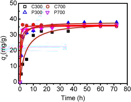 In Figure 3, results from studying the adsorption kinetics of DBSA on biochars are shown. The results indicated that the adsorption of DBSA on C700, P300, and P700 was relatively slow. However, it was faster than the adsorption of DBSA on soils and Mollisol soil HA []. Within 5 h of solution/biochar contact, 89.67%, 78.34%, and 83.09% of the initial DBSA amount were removed by C700, P300, and P700, respectively. After 10 h, the adsorption of DBSA almost reached its equilibrium with 91.05%, 81.69%, and 85.28% removal efficiencies. For C300, the adsorption seemed to approach equilibrium in 48 h, with a removal efficiency of 89.50%. Kinetic equation parameters for the adsorption of DBSA on biochars are listed in Table 3. Pseudo-second order kinetic was more suitable in describing the adsorption kinetics of DBSA on biochars (R2, 0.992–0.999). It was confirmed that chemical adsorption was the rate-limiting mechanism []. From the adsorption rate constant, it appears that DBSA adsorbed more quickly to the biochars prepared at high temperature than to the biochars made at low temperature.