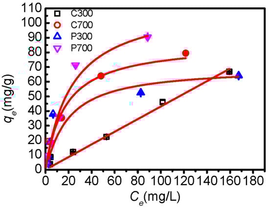 The adsorption isotherms of DBSA on biochars were demonstrated in Figure 4. DBSA adsorption capacity on biochars increased with the increasing pyrolysis temperature. Linear, Freundlich, and Langmuir models were applied to fit the isotherms, and the parameters of the isotherm equations were listed in Table 4. The linear model fit well for the adsorption of DBSA on C300, which indicated that the DBSA was partitioning into the non-carbonized organic matter of C300 []. The adsorption of DBSA on C700, P300, and P700 were best fit to the Langmuir isotherm under the concentration range studied, which confirmed that the adsorption occurred on a homogenous surface by monolayer adsorption []. It also indicated that a strong adsorption affinity existed between biochars and DBSA, and it was the anion exchange interaction that made the sulfonate ion adsorbed onto poplar leaf biochars and C700 []. Interestingly, the surface area of C700 was the biggest among four samples (Table 1), approximately 3.6 times that of P700 (Table 1), but qmax of DBSA on P700 (155.9 mg/g) was the highest. Furthermore, P300 had the highest average pore size (12.27 nm), but the lowest qmax. Therefore, surface area and average pore size were not the factor governing the adsorption capacity. This suggests that P700 has great potential in pollution control of surfactants.