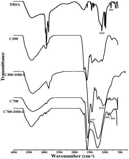 In Figure 6, after the adsorption of DBSA on P300, the band at 3365 cm−1 shifted to the lower frequency 3333 cm−1, which suggested the strong interaction formed through the H bond []. An increase in the intensity of the band at 1225 cm−1 could also confirm the formation of a H bond []. The peaks at 2926 cm−1and 2854 cm−1 became stronger, which indicated that the aliphatic C-H groups of DBSA were adsorbed on P300 []. The shape of the adsorbing peak of 1612 cm−1 became wider and the peak intensity increased, which could be ascribed to the adsorption on C=O groups. The appearance of an additional band at 831 cm−1 was the consequence of the interaction of aromatic C-H groups of DBSA with P300. The FTIR spectra of P700-DBSA showed no significant change in comparison to P700, which indicated that the adsorption of DBSA on P700 did not alter the structure.