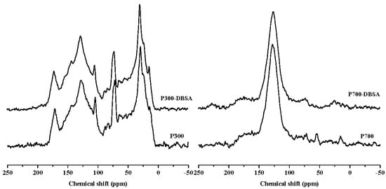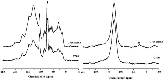 Organic free radicals in humic acid or biochars have attracted considerable attention because of their potential for the adsorption and degradation of organic contaminants [,]. The g values observed for the biochars–DBSA complexes were the same as the g values of original biochars, thus indicating that no additional free radical species were generated []. Organic free radical concentrations increased in the interaction products of biochars and DBSA, relative to the original biochars, in the order: P700 > P300 > C300. These results could be the reason for the formation of charge-transfer between the electron donating carbonyl groups of biochars and the electron acceptor benzene ring of DBSA []. The enlargement of the line width in the interaction product of P700-DBSA was the consequence of the formation of covalent bonds between DBSA and P700 []. The covalent bonds might play a more important role in making the adsorption capacity of P700 higher than that of other biochars.