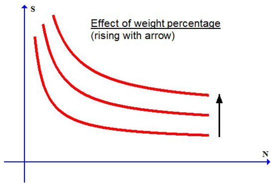 Typical S-N curves for the fatigue failure of MMCs under cyclic loading conditions are schematically shown in Figure 1 for different cases of the weight percentage of reinforcing particles. As reported in experiments (cf., e.g., [4,5,6,7]), the S-N curve goes up with increasing weight percentage of reinforcing particles. Each curve becomes nearly flat at very high cycles. This implies that, whenever the stress amplitude is below a limiting value, referred to as the fatigue limit, the cycle number to failure will become indefinitely large and the fatigue failure in this case actually will not take place.