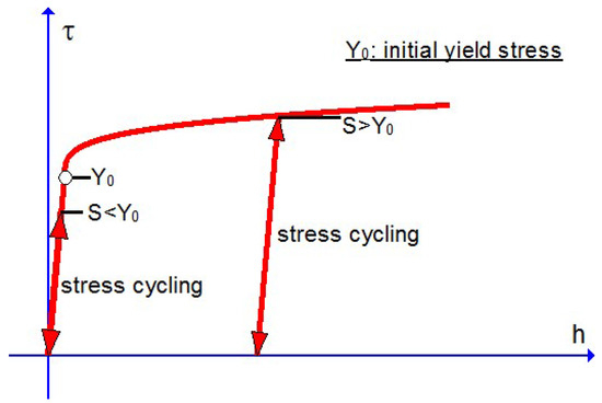 According to the classical theory of elastoplasticity, the plastic indicator in Equation (5) is assumed to be given by the idealized approximation below: no plastic deformation would be induced prior to yielding, whereas plastic deformation would be induced only in the case when yielding is attained and maintained. Specifically, for the unloading case and for the loading case (refer to, e.g., [35] for details).