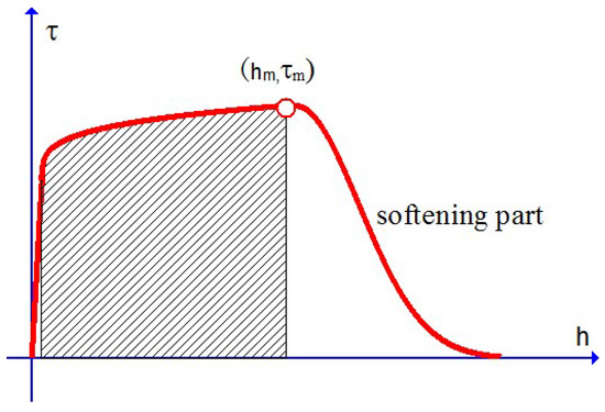 The main feature of the stress limit q given by Equation (9) is as follows: for a fairly large , the stress limit q actually yield a constant value, , before the plastic work reaches a critical value slightly greater than . After the plastic work reaches the critical value , the stress limit goes rapidly down to vanish with softening effect up to eventual failure. The dimensionless parameter is referred to as the softening index of the following property: the greater the is, the more rapidly the stress limit q goes down to vanish. All these three parameters may be evaluated with a uniaxial tensile curve with softening effect, as illustrated in Figure 6.