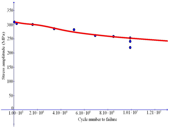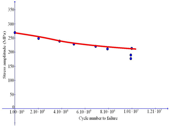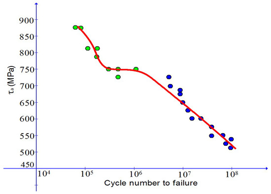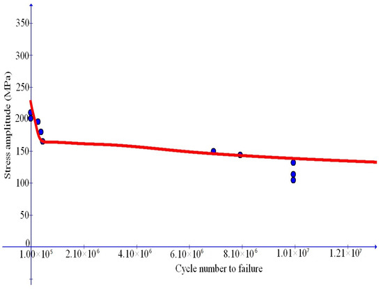 In this subsection, model prediction will further be validated by simulating low-to-high cycle fatigue failure data displaying the complex duplex effect as indicated in Figure 2. Toward this end, the most recent data in [25] is taken into consideration. In this reference, data are provided for JIS SUS630 stainless steel under symmetric stress cycles with the ratio .