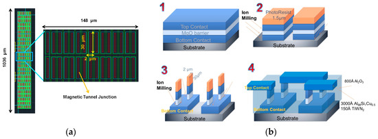 (a) Detail of the Wheatstone bridge resistances, which include 360 individual 2 × 30 µm2 MTJ elements connected in series; (b) Description of the microfabrication process to connect the 2 × 30 µm2 elements in series.