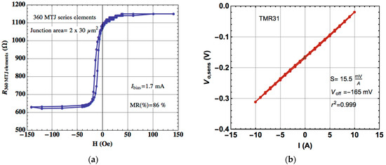 The MTJ sensors were characterized individually, using the test structures indicated in Figure 1. Figure 3a shows the resistance-magnetic field characteristics of each MTJ sensor (360 MTJ elements in series), with magnetoresistance (TMR) values of 86%. The small coercivity and shift are the signature of the weekly pinned biasing at the free layer [31]. Figure 3b shows the bridge sensor output voltage under a current sweep between the interval −10 A to +10 A circulating through the U-shaped copper trace. A high electrical sensitivity of 15.5 mV/A was obtained, making the subsequent electronic signal amplification easier to achieve.