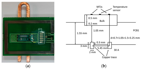 (a) Printed circuit board (PCB) including the complete tunneling magnetoresistance (TMR) transducer and the U-shaped copper current trace; (b) Cross-section schematics of the geometry used for this device, showing the copper trace dimensions as well as the sensor to trace distance.