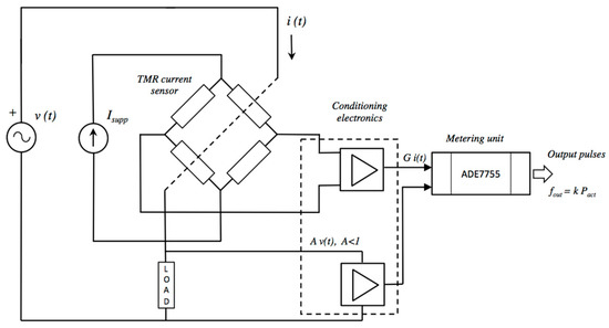 Figure 5 shows a general block diagram of the proposed electronic energy meter. It comprises the TMR sensor (described previously), the signal conditioning electronics, and the metering section.