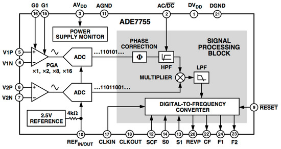 There exists a wide range of electronic processors made by different manufacturers. They process electrical energy delivered to a load from the 50/60 Hz AC mains and offer at their output a variety of associated parameters like active and reactive powers or rms (root-mean-square) voltage and current [33,34]. In this work, the ADE7755 energy processor from Analog Devices (Norwood, MA, USA) was used [35]. This unit was designed to measure the active power supplied to an electric load by a monophasic AC line. Figure 6 shows its internal block diagram. It can be distinguished by three fundamental sections: analog signal processing and acquisition, digital signal processing, and conversion and power supply unit.