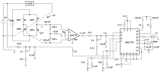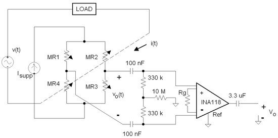 Because the TMR current sensor is in a Wheatstone bridge topology, its output is a differential voltage signal vo(t) that requires differential-to-unipolar electronic conditioning. Figure 7 shows this electronic circuit in detail. A fully differential high-pass filter is connected at the current sensor output to reject DC offsets caused by the existent mismatching between the value of the four MR1 to MR4 active elements at zero current. Following the filtration, an instrumentation amplifier (INA118 model from Texas Instruments) is used to provide the necessary gain and to convert the differential signal in an unipolar Vo output voltage easily acquired by the energy processor. At its output, a simple 3.3 μF capacitor is connected to reject the possible offset due to instrumentation amplifier. Isupp is a DC constant that is the current source implemented to bias the Wheatstone bridge.
