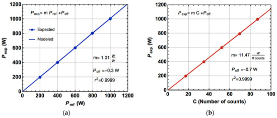 The experimental procedure was to take the number of output pulses provided by the ADE7755 at its CF (calibration frequency) output corresponding to 200, 400, 600, 800, and 1000 W power consumptions of pure resistive load during a 24-h period for each power value. A reference wattmeter (2551 from Xitron) was used to select the different powers delivered to the load. The experimental active power obtained from the CF output was compared with the readings of the reference wattmeter; Figure 10a shows that comparison and Figure 10b depicts the experimental relationship between the active power and the number of counts at the CF output. A conversion factor of 11.47 W/number of counts was obtained with a very low value of residual power (0.7 W). Figure 10c shows that the maximum relative uncertainty was less than 1.5% in the specified active power interval. To check the wattmeter behavior with no pure resistive loads, a 30 μF capacitor was connected in series (Figure 9) to shift the power factor to a cos ϕ = 0.75 value. Table 1 shows the relative uncertainty obtained with this test.