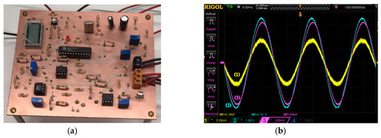 (a) Prototype energy meter implementation; (b) Experimental waveforms: (1) TMR sensor output voltage (6.2 mVrms); (2) Conditioned output voltage (2.51 Vrms); (3) Electrical current through resistive load (4.59 Arms and Pload = 1000 W).