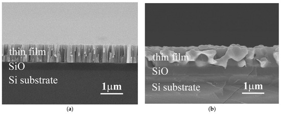 Figure 1a,b show the typical cross-section SEM images of as-deposited and as-annealed TixFeCoNi thin films, respectively. All of these three alloy thin films had a similar micrograph under as-deposited or as-annealed state. The as-deposited thin film has a columnar structure, shown in Figure 1a. However, each single column was not a single grain. TEM observation described below proved that the FeCoNi alloy thin film had a nano-grained structure. This nano-grained structure would become an amorphous structure after the Ti-content increased; the TiFeCoNi alloy thin film thus had a fully amorphous structure. The microstructures of these thin films become to a coarse-grained one after vacuum annealing at 1000 °C for 30 min, shown in Figure 1b; and different phases were formed after annealing because of diffusion of atoms and oxidation.