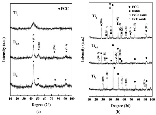Figure 2b reveals new diffraction peaks in the XRD patterns of the films subjected to vacuum annealing. The Ti0 film presents the FeCoNi peaks and FeCo-rich oxide peaks that correspond to the FCC structures with lattice constants of 3.55 and 8.38 Å, respectively. The Ti0.5 film yields FeCoNi-rich, rutile-TiOx, and FeTi-rich oxide peaks. FeCoNi-rich peaks show an FCC structure with a lattice constant of 3.59 Å. Rutile peaks have a TiOx structure (JCPDS: 76-0321) with lattice constants of a = 4.59 Å and c = 2.95 Å. FeTi-rich oxide peaks have a HCP structure with lattice constants of a = 5.09 Å and c = 14.06 Å, which are similar to FeTiO3 (JCPDS: 79-1838). The Ti1.0 film presents FeCoNi-rich, FeCo-rich oxide, and rutile peaks. The FeCoNi-rich and FeCo-rich oxide peaks indicate an FCC structure with lattice constants of 3.57 and 8.75 Å, respectively. However, the rutile peaks correspond to the TiOx structure (JCPDS: 76-0321) with lattice constants of a = 4.609 Å and c = 2.963 Å. Overall, the as-annealed thin films retained an FCC and FeCoNi-based metal phase and formed oxides.