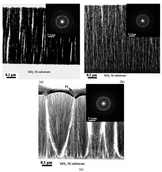 Figure 3a–c present the TEM bright field (BF) images and the corresponding selection area diffraction patterns (SAD) of the cross-sectional microstructures of the as-deposited Ti0, Ti0.5, and Ti1.0 thin films with a columnar structure and void striations (white area) along the column boundaries [5]. The voids were unavoidable because of the shadow effect associated with oblique deposition at room temperature and without an applied bias voltage. Without atom mobility and ion bombardment enhanced by high temperature and bias bombardment, eliminating the formation of voids during deposition is difficult. Additionally, the ring patterns of these thin films indicates that the Ti0 and Ti0.5 alloy thin films have nano-crystalline structures, and Ti1 alloy thin film has an amorphous structure.