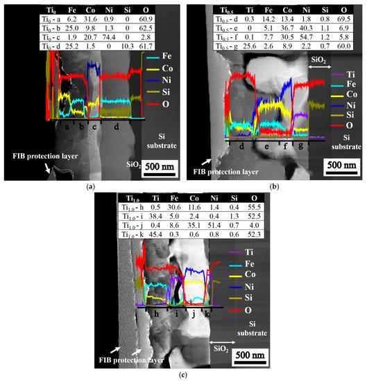 Composition distribution of as-annealed TixFeCoNi thin films, as determined using TEM and EDS: (a) Ti0; (b) Ti0.5; and (c) Ti1.0 films.