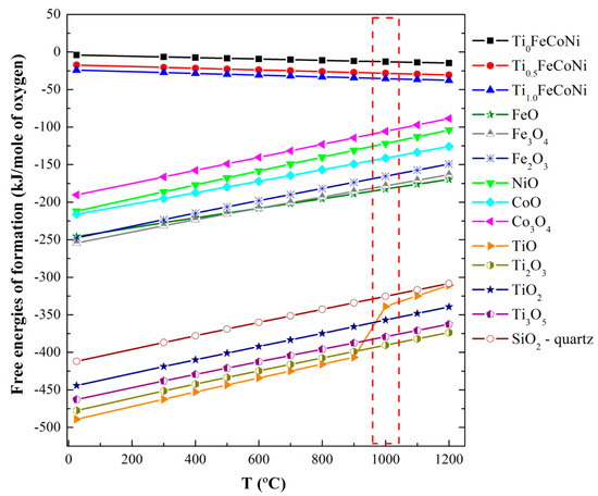 The layered structure with different phases can be explained from the perspectives of thermodynamics and kinetics. The formation of this structure can be attributed to two factors. (1) Chemical affinity competition or stronger affinity in metal–oxygen pairs, such as SiO and TiO, is preferred to form oxides [6,7]. At 1000 °C, the free energies of the formation follow the increasing order of TiO < SiO < FeO < CoO < NiO (Figure 5); (2) Diffusion rate competition due to the decreasing order of O > Fe > Co > Ni > Ti [8] involves the formation of Fe and Co atoms with high diffusion rates on the top layer, although Ti atoms likely form oxides. The free energies in Figure 5 have been calculated at different temperatures by using Equations (1)–(3) [7]