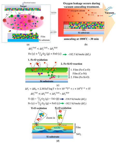 Schematic diagram showing the formation of phases in TixFeCoNi films from the as-deposited state to the post-annealed state: (a) DC sputtering deposition of thin film on Si substrate; (b) oxygen coming from the vacuum chamber and SiO2 substrate during vacuum annealing; (c) diffusion pathways and layer formation in Ti0 film during annealing; and (d) diffusion pathways and layer formation in Ti0.5 and Ti1.0 films during annealing.