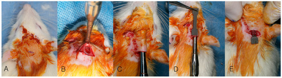 Fifty-five 10-week-old Sprague-Dawley rats (body weight of 300–350 g, Orient Corp., Seoul, Korea) were randomly divided into two groups after a two-week adaptation period. Uncoated magnesium plates were inserted into the calvaria of 25 rats (Bare-Mg group), and hydroxyapatite-coated magnesium plates were inserted into the calvaria of 30 rats (HA-Mg group). Rats were put under general anesthesia using a mixture of xylazine (Rompun®, 20 mg/mL, Bayer Korea Ltd., Seoul, Korea) and ketamine hydrochloride (Ketalar®, 50 mg/mL, Yuhan Corp., Seoul, Korea) (1:4 volumes, dosage 0.15 mL/100 g) delivered via intraperitoneal injection. The cranial hair was shaved, and the exposed skin was sterilized by povidone-iodine painting. Transverse skin incision was made and the periosteum was elevated with a periosteal elevator. The Mg plate was inserted carefully underneath the periosteum and the flap was closed using 5-0 nylon (Ethicon®, Johnson & Johnson, New Brunswick, NJ, USA) (Figure 2). Five rats each were sacrificed using CO2 asphyxiation at 2, 4, 6, 8, and 12 weeks in the Bare-Mg group, and 2, 4, 6, 8, 12, and 24 weeks in the HA-Mg group.