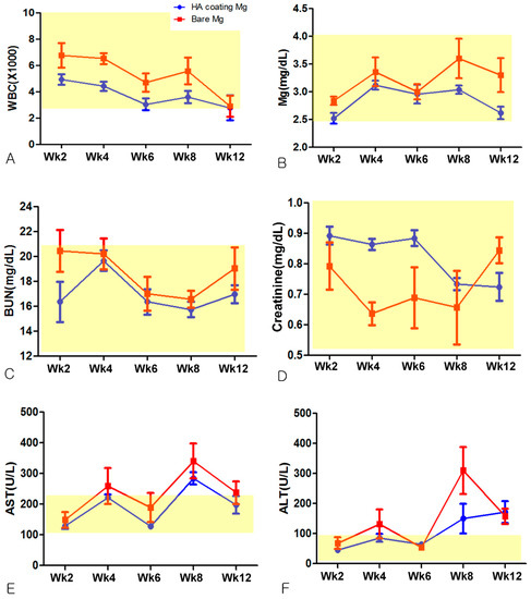 Lim et al. [15], in 2016, reported that the blood magnesium level was found to be within the normal range when WE43 Mg alloy was inserted on the tibia of rabbits. Zhang et al. [16] ran blood tests after inserting a Mg-Zn-Mn alloy on the femur of rats, and the result showed elevated BUN, serum creatinine, AST, and ALT above the norm. They theorized that resorbed magnesium may be metabolized in the kidneys. The results of this study, however, showed blood lab results within normal limits except for AST and ALT, which are indicators of liver function. Although the lab results showed generally higher mean values in the Bare-Mg group except for serum creatinine on week 12, no statistically significant difference between groups was noted except for higher WBC level in the Bare-Mg group at week 4 (p < 0.05). These results show that in vivo corrosion and absorption of magnesium does not affect hematologic functions significantly. The elevation of AST and ALT values is presumably due to post-operative stress or the insertion of a large-volume magnesium plate relative to the size of the rat.