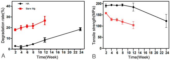 Degradation rate and tensile strength: (A) Degradation rate; (B) Tensile strength.