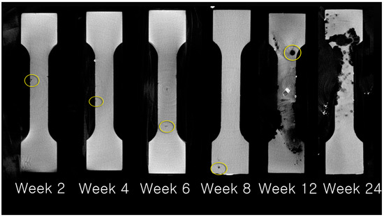 Pattern of resorption of HA-Mg plates examined using micro-computed tomography. Resorption had pin-point-like appearance until week 8 (yellow circles). Resorption progressed rapidly beginning at week 12.