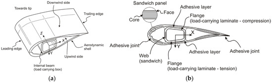 Blade design with a load-carrying box girder [23]. (a) The main elements of a wind turbine blade and (b) Nomenclature of the different blade construction elements.