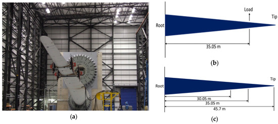 (a) 47.5 m blade attached to Hub Centre 1; (b) position of applied load point in calibration test and (c) the positions of the saddles on the blade for fatigue tests.
