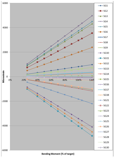 Strain gauges SG21 to SG30 are attached to the shear web on TE side at ±45° and located from 4 m to 20 m from the root. The readings from these gauges at the first cycle are shown in Figure 12c. The strain along the first half of the blade length from the root varies between 24.5 με and 378 με. In flapwise fatigue, the maximum strain readings in the shear web occurred at SG23 and SG24 attached to the shear web, located at 17.5% of the blade length from the root.