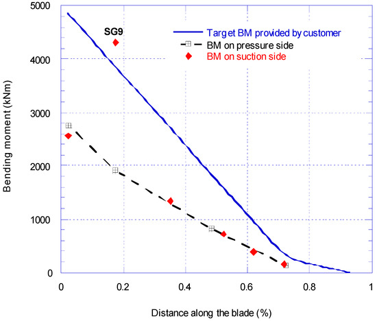 Figure 5 shows the bending moment distribution along the blade. There are three set of data in Figure 5; target BM (solid line), pressure side (dash line) and suction side (diamond markers) BM. The applied BM on the blade was obtained by extrapolating the calibration test results. As explained before, the maximum target BM is set at 50% of expected BM in service. Therefore, the results for pressure and suction bending moments are at 2500 kNm at the root which is equivalent to 50% of estimated target BM. On the suction side the reading of strain gauge SG9 is unreliable and instead SG10 was used for the analysis of the bending moment.