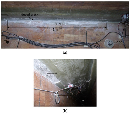 Extension of the crack to 1000 mm at 9 m from the blade root. View from (a) outside of the shear web box; (b) from inside of the shear web box.