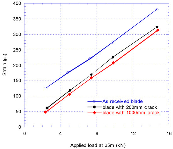 New calibration tests were performed to find the new bending moment distribution along the cracked blade. Figure 8 compares the calibration pull-test results from SG2 strain gauge reading for as received blade, blade with 200 mm crack and extended 1000 mm crack.