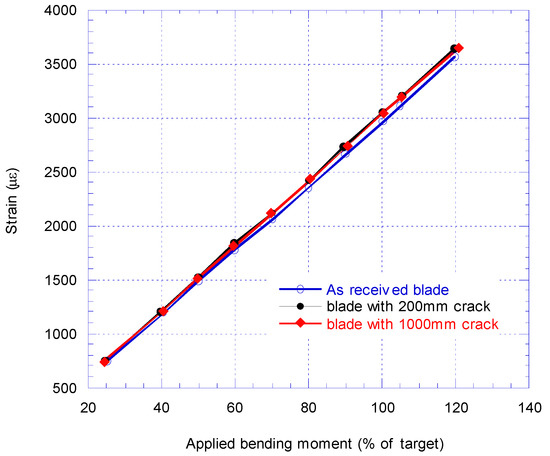 Figure 9 compares the BM at the blade root (as % of target BM) versus strain at SG2 for as received blade, and when 200 mm and 1000 mm crack introduced to the blade. At 70% BM, SG2 reaches 2132 με for an induced crack of 200 mm while for the 1000 mm extended crack the SG2 reading is 2135 με. The slight difference could be due to a number of reasons such as added saddle mass, movement of the saddle, ±0.5% accuracy of strain gauges, temperature, etc.