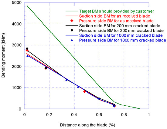 Figure 10 compares the BM distribution along the blade for all three calibrations pull-test when the maximum BM at the root is set equal to 50% of the maximum target BM at the root. The result for the pressure side BM is lower than the suction side. When comparing the results of the 1000 mm cracked blade at 10% of the blade length, the strain gauge reading decreased by 13.1% in comparison with the 200 mm crack damage.