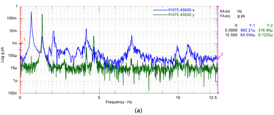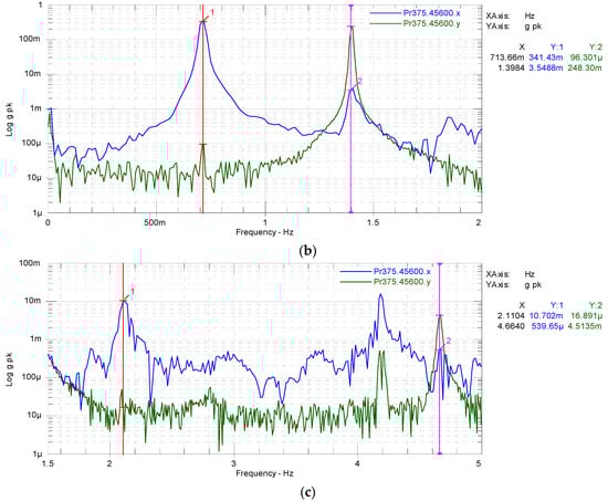 Figure 11b shows a magnified area of Figure 11a between 0 Hz and 2 Hz to quantify accurately the results for the first natural frequency. The first natural frequency for flapwise (blue line) and edgewise (green line) were 0.713 Hz and 1.398 Hz, respectively.