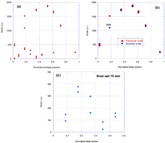 Strains along the as received blade at the first cycle of fatigue test: (a) all 30 strain gauges; (b) only for gauges on pressure and suction side and (c) only for gauges on the shear web on TE side.