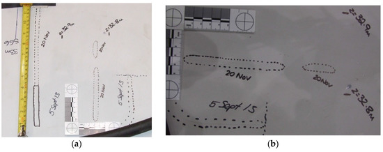 (a) Propagation of existing crack at 32.96 m after 26,851 cyclic loading; (b) Formation of hair line cracks at 32.8 m after 26,851 cyclic loading.