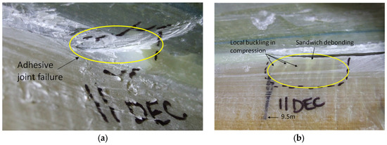 (a) Adhesive debonding outside the web box at 8.5 m; (b) local buckling under compression and sandwich debonding outside the web box at 9.5 m.