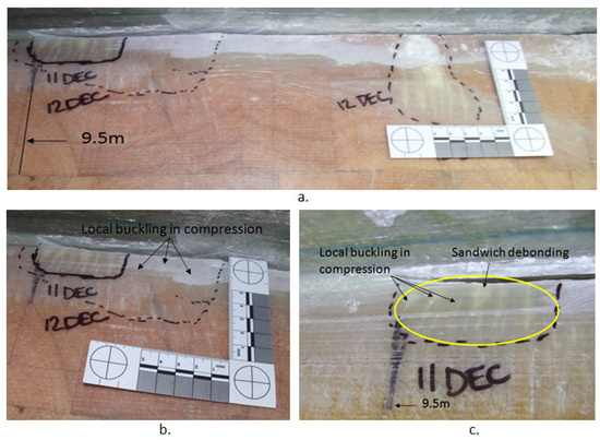 Outside web at 9.5 m (a) overview of local buckling under compression and sandwich debonding (b) magnified view of damage at 9.5 m (c) magnified view of damage at 9.3 m.
